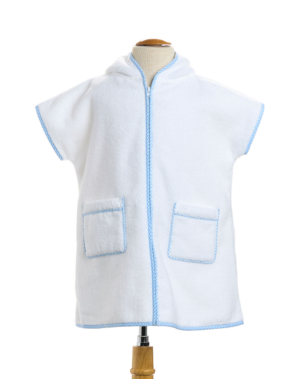 Head to the pool or the beach in luxury with our plush white terrycloth cover up featuring adorable blue gingham trim and a cozy hood. This beautifully crafted cover up includes two gingham trimmed pockets and a zip closure, making it as functional as it is stylish. Perfectly packaged in a bag with a waterproof lining and an embroidered cover up design, it also makes an ideal gift. The soft and absorbent material is made to last, and the cover up is great for personalization with a monogram.